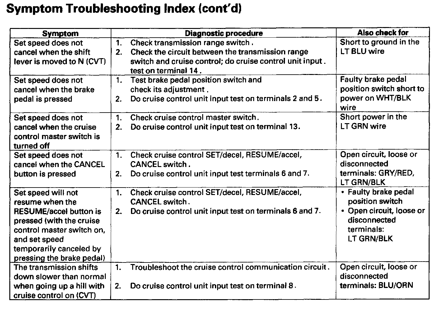 Cruise Control Symptom Troubleshooting Index: