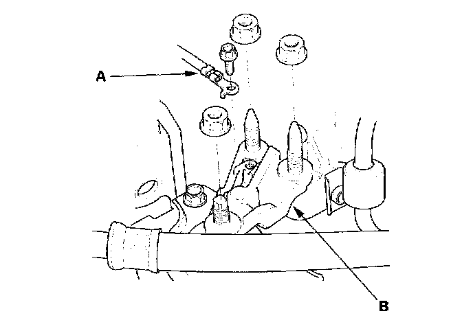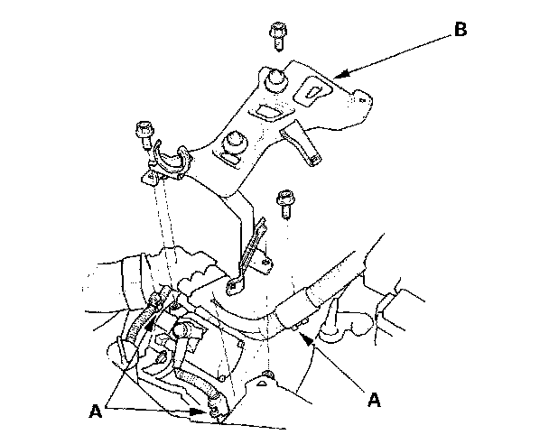 8. Remove the harness clamps (A), then remove the air cleaner housing bracket (B).