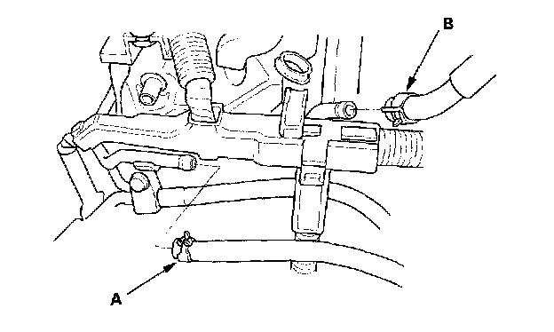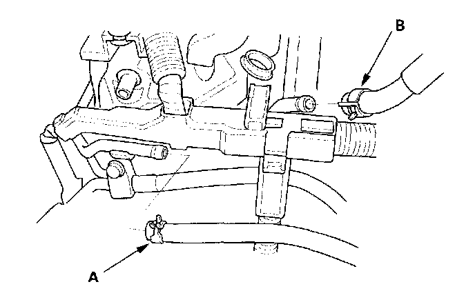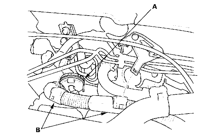 11. Remove the evaporative emission (EVAP) canister hose (A) and brake booster vacuum hose (B).