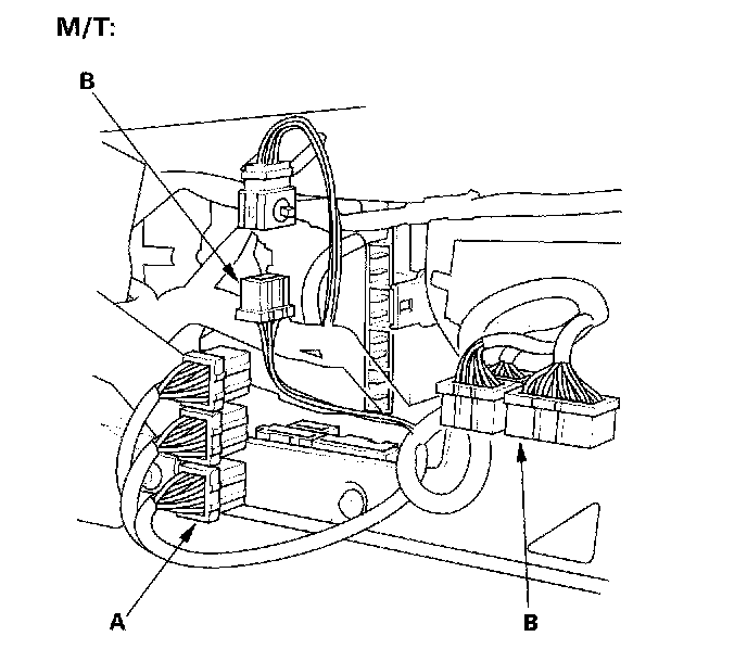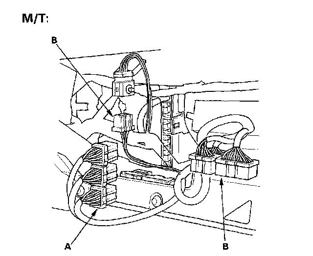 13. Remove the harness clamps (A) and grommet (B), then pull the engine wire harness through the bulkhead.