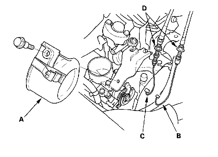 14. Remove the throttle cover (A). Fully open the throttle link and cruise control link by hand, then remove the throttle cable (B) and cruise control cable (C) from the links. Loosen the locknuts (D), and remove the cables from the bracket.