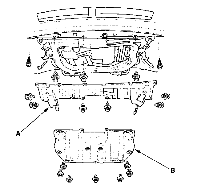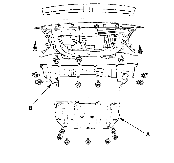 22. Remove the under-cover (A) and splash shield (B).