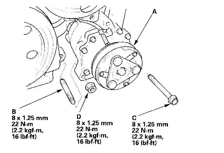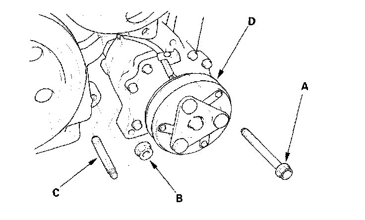 26. Remove the stud bolt (C), then remove the A/C compressor (D) without disconnecting the A/C hoses.