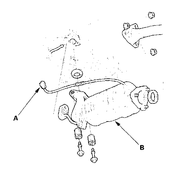 27. Disconnect the third heated oxygen sensor (third HO2S) connector (A), then remove the NOX adsorptive three way catalytic converter (NOX adsorptive TWC) (B).
