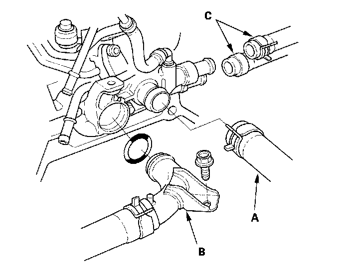 35. Remove the upper radiator hose (A), lower radiator hose joint (B) and heater hoses (C).