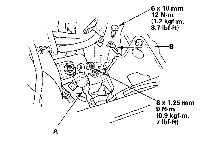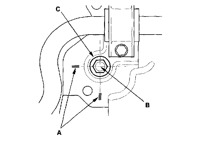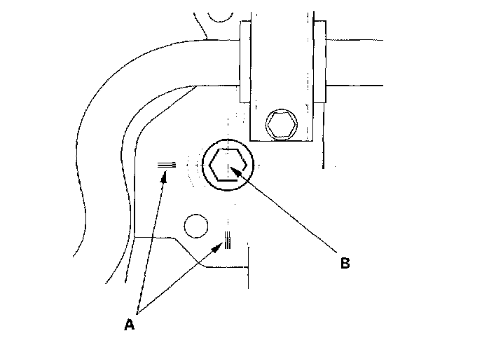 5. Align the reference marks (A) that you made on the subframe with the center (B) of the bolt heads, then tighten the bolts to the specified torque.