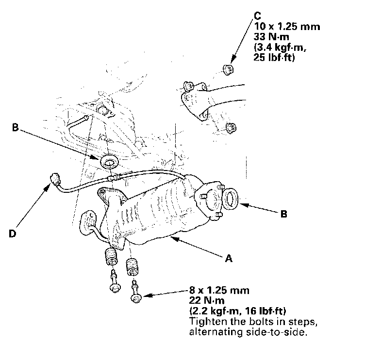 19. Install the NOX adsorptive three way catalytic converter (NOX adsorptive TWC) (A); use new gaskets (B) and new self locking nuts (C).