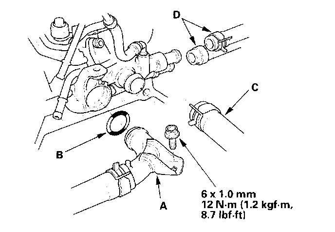 31. Install the upper radiator hose (C) and heater hoses (D).