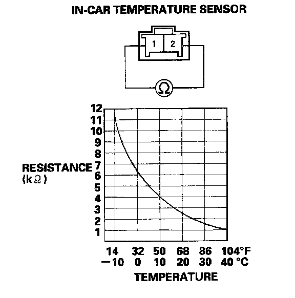 Compare the resistance reading between the No.1 and No.2 terminals of the in-car temperature sensor with the specifications shown in the graph; the resistance should be within the specifications.