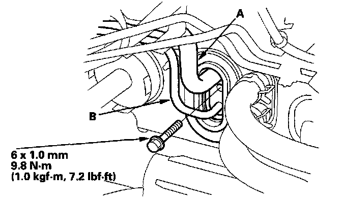 2. Remove the bolt, then disconnect the suction line (A) and the receiver line (B) from the evaporator core.