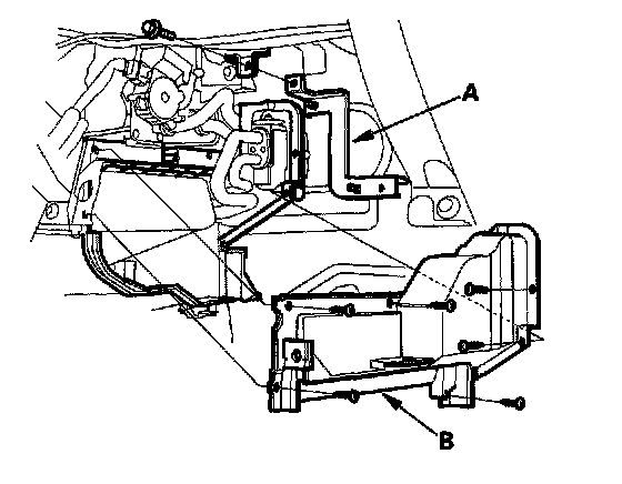 4. Remove the bolt and the ECM bracket (A). Remove the self-tapping screws and the expansion valve cover (B).