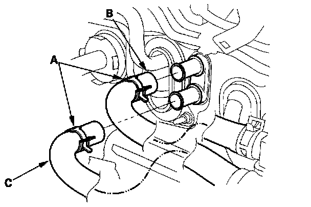 6. Slide the hose clamps (A) back, then disconnect the inlet heater hose (B) and the outlet heater hose (C) from the heater core. Engine coolant will run out when the hoses are disconnected; drain it into a clean drip pan. Be sure not to let coolant spill on the electrical parts or the painted surfaces. If any coolant spills, rinse it off immediately.