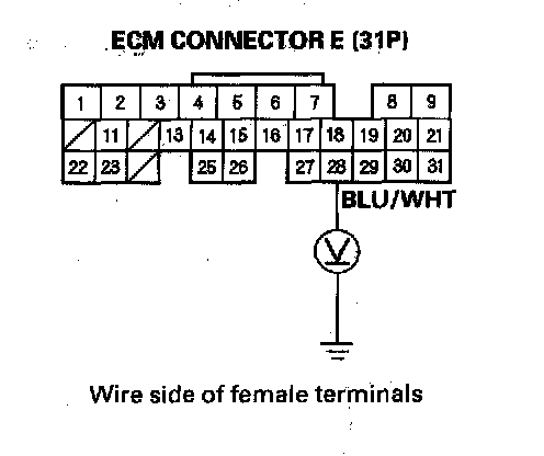 20. Using the backprobe set, measure the voltage between the No. 28 terminal of ECM connector E (31 P) and body ground with the ECM connectors connected.