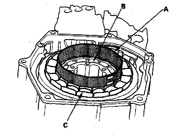 5. Insert a plastic film (A) between the motor rotor (B) and the motor stator (C).