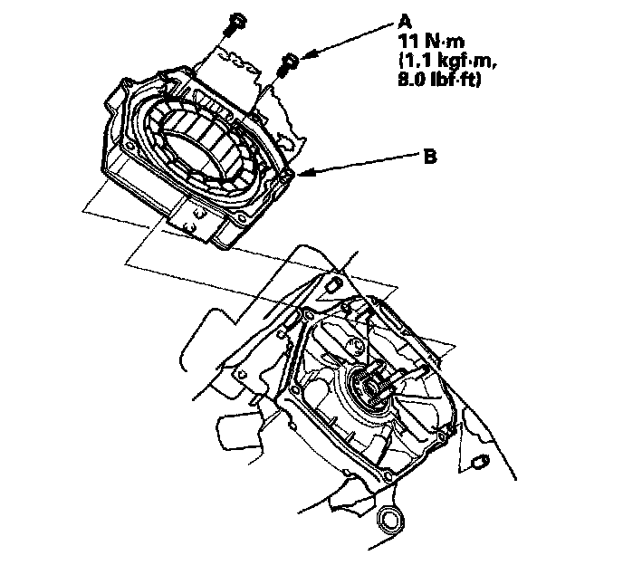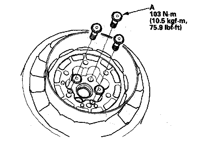 7. Install the rotor puller guide pins, then remove the remaining three bolts (A), and remove the rotor spacer (B).