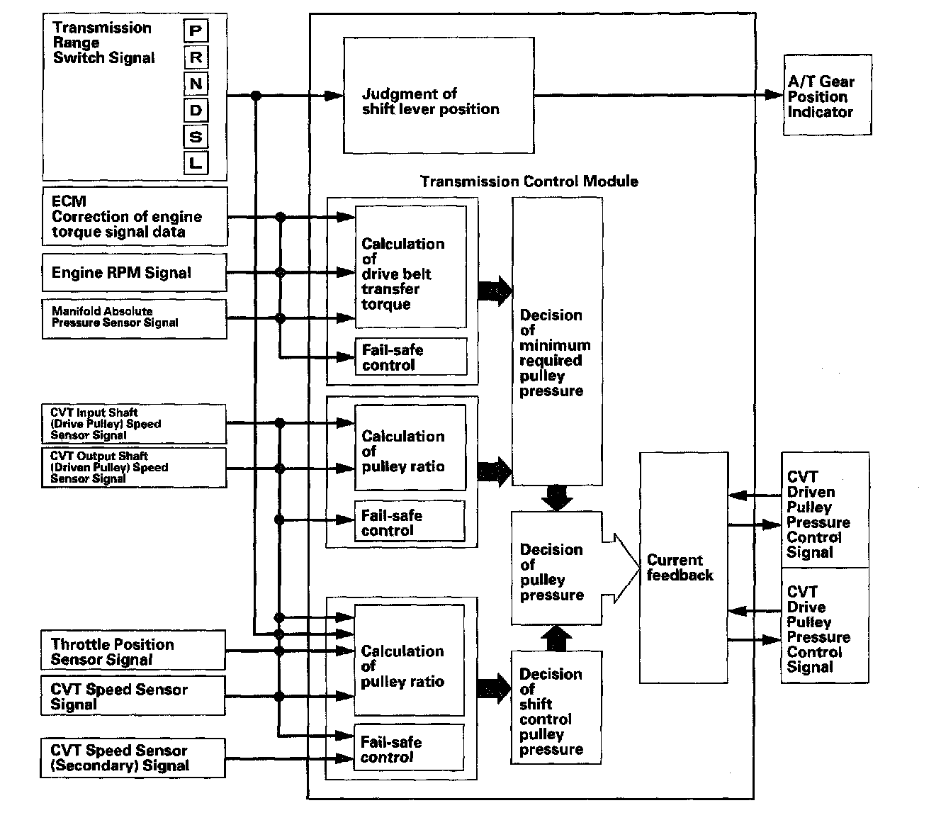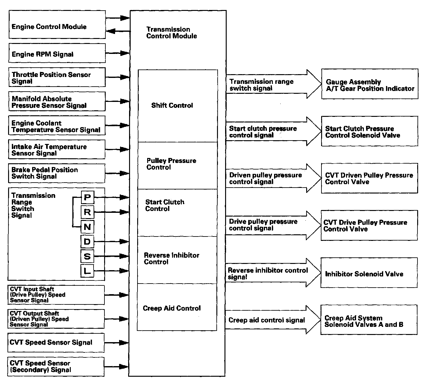 The TCM inputs signals from the ECM, sensors and switches, perform processing data, and outputs signals for automatic transmission control system. The A/T control system includes the shift control, pulley pressure control, start clutch pressure control, reverse inhibitor control, and creep aid control, and is stored in the TCM. The TCM actuates the pulley control solenoids to control the pulley control valves A and B shifting transmission pulley ratios.