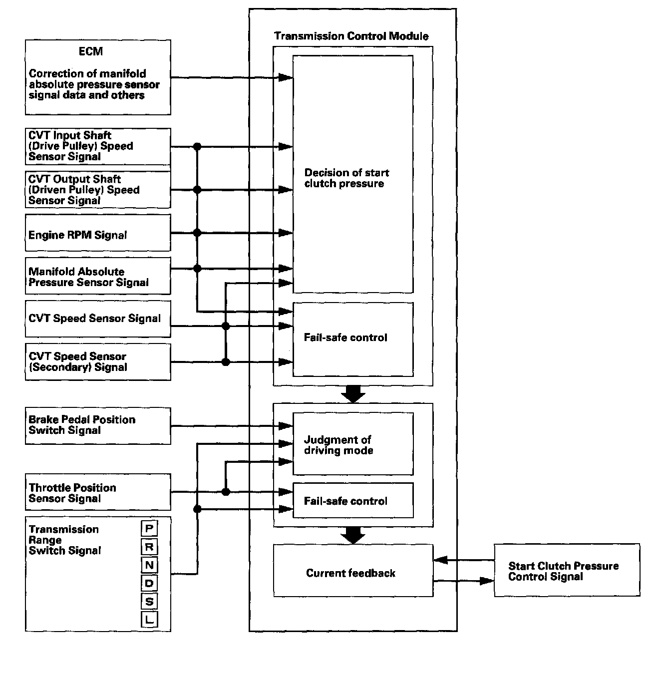 The hydraulic-controlled start clutch controls smooth starting-off and creeping in the D, S, L, and R positions like a torque converter. The TCM inputs signals from the ECM, sensors, and switches, and actuates the start clutch pressure control valve to regulate the clutch reducing pressure, and the clutch reducing pressure controls the start clutch.
