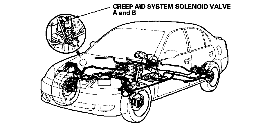 When the engine auto-starts, the ATF pump builds up enough pressure for the start clutch to engage. The TCM turns creep-aid system solenoid valve A and B OFF, when certain parameters are met, releasing the brakes.
