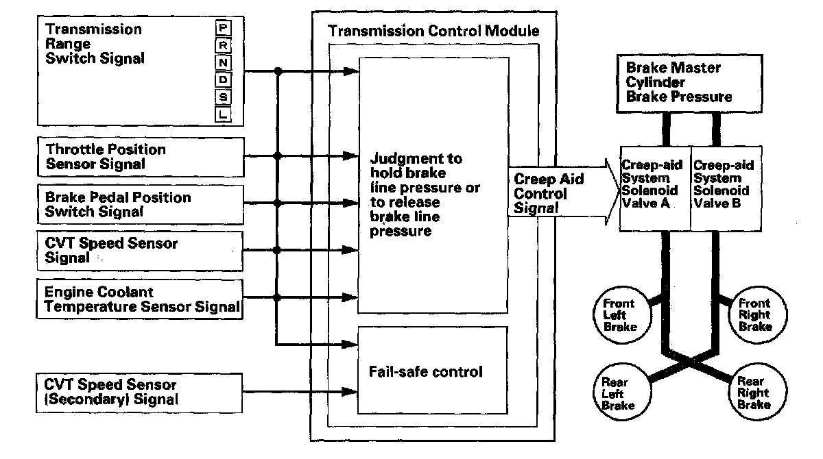 The Creep Aid Control System keeps the brakes applied during auto idle stop. This prevents the vehicle from rolling forward or backward between the time the driver releases the brake pedal (to press the accelerator pedal) and the engine starts, engaging the start clutch.