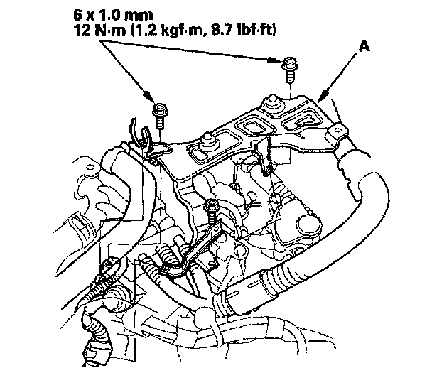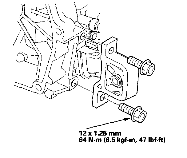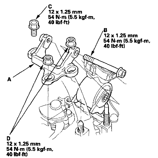 10. Install the transmission mount bracket (A), and tighten the mount bolt (B) loosely. Install the mount bracket bolt (C) and nuts (D), and tighten them to the specified torque, then tighten the mount bolt to the specified torque.