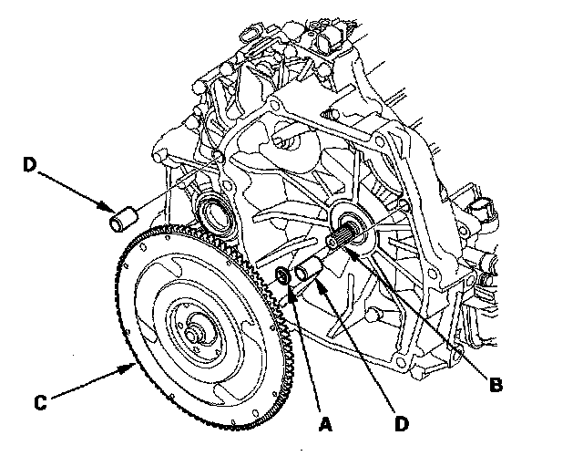 6. Install the flywheel (C) on the input shaft, and install the 14 mm dowel pins (D) in the flywheel housing.