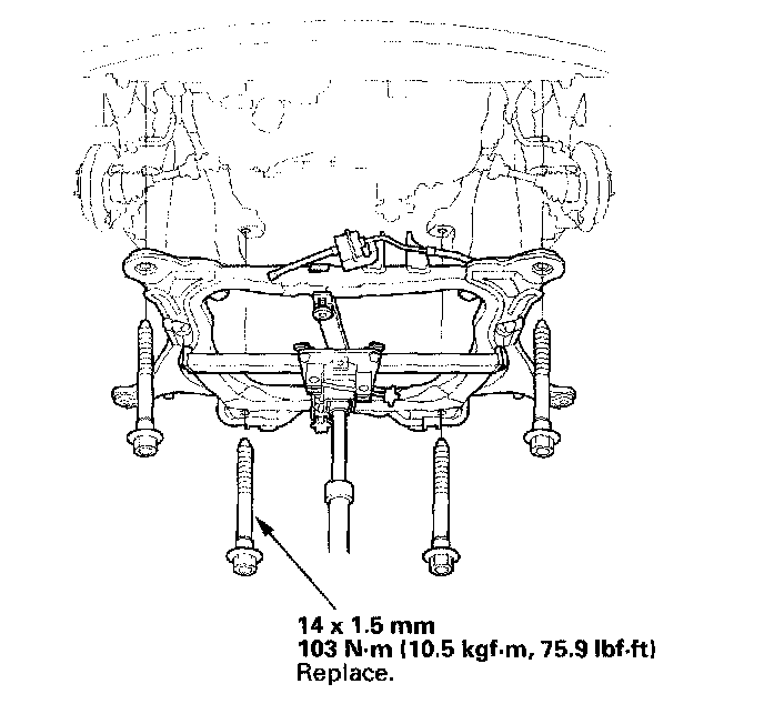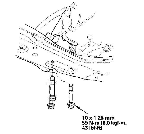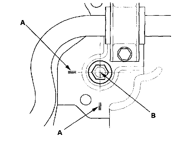 23. Align the reference marks (A) with the center of the subframe mounting bolts (B), then tighten the bolts to the specified torque.