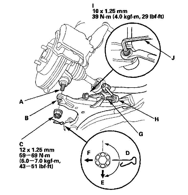 27. Connect the ball joint pins (G) of the front stabilizer link (H) to the lower arms, and install the nuts (I). Install a 5 mm Allen wrench (J) in the top of the ball joint pins, and tighten the nuts.