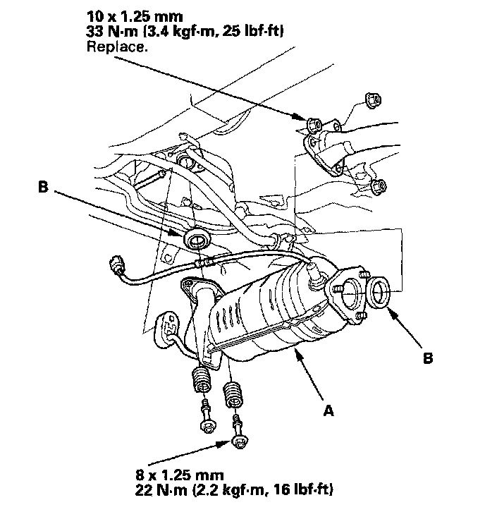 28. Install the exhaust pipe A and the three way catalytic converter as an assembly with the new gaskets (B).