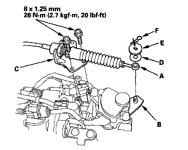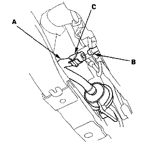 34. Install the shift cable end (A) on the control lever (B), and install the shift cable bracket (C) on the transmission. Do not bend the shift cable excessively.