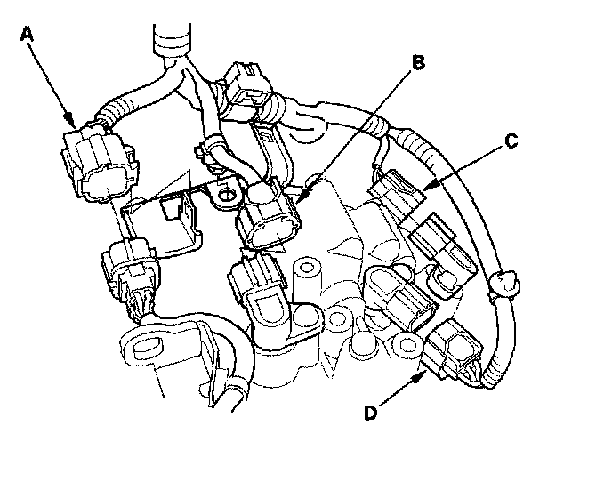 33. Connect transmission range switch connector (A), CVT output shaft (driven pulley) speed sensor connector (B), CVT speed sensor connector (C), and CVT speed sensor (secondary) connector (D).