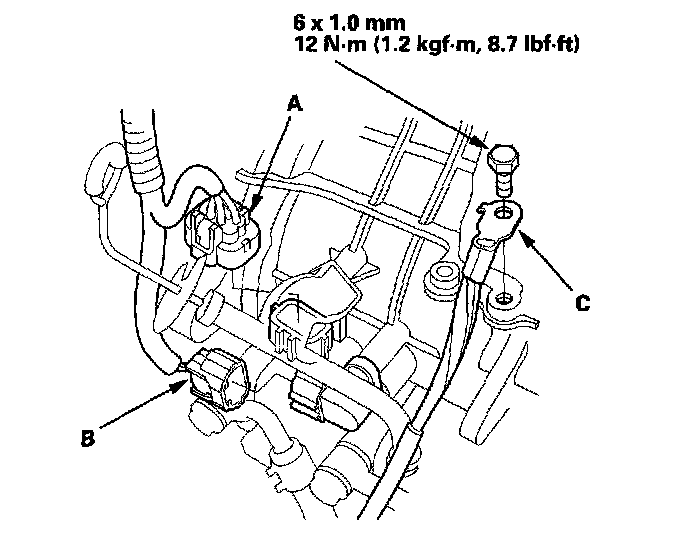 36. Connect solenoid harness connector (A) and CVT input shaft (drive pulley) speed sensor connector (B), and install the transmission ground cable (C).
