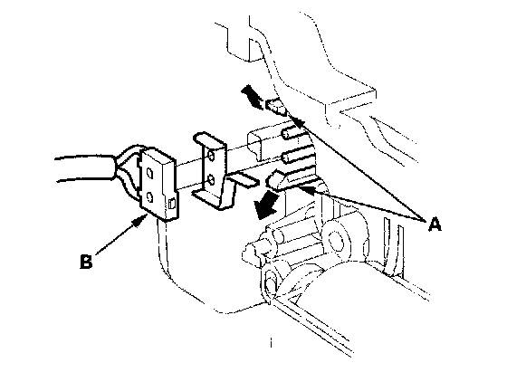 7. Open the lock tabs (A) on the shift lever bracket base, then remove the park pin switch (B).