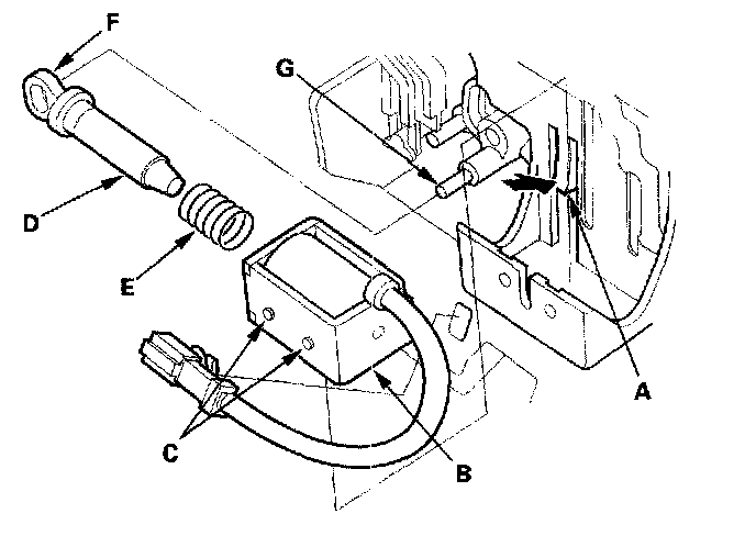4. Install the shift lock solenoid plunger (D) and plunger spring (E) in the new shift lock solenoid.