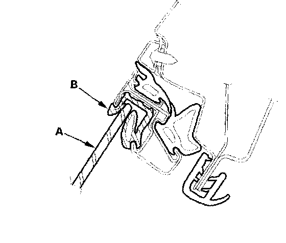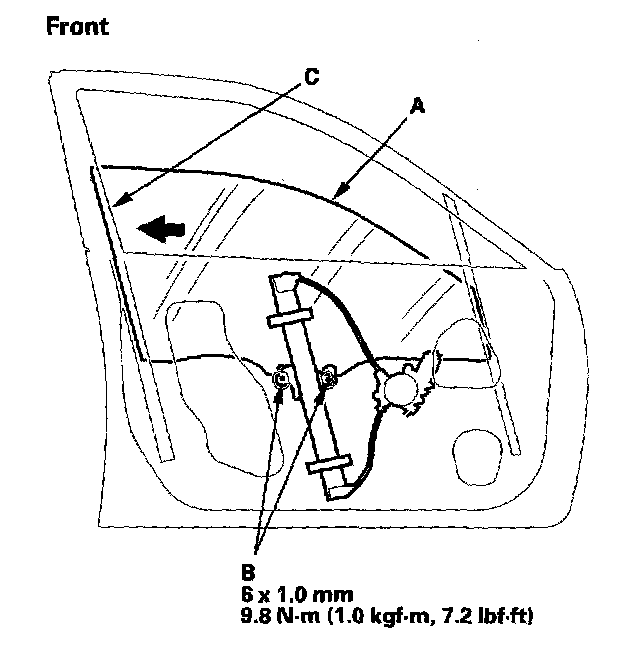 6. Raise the glass fully, and check for gaps. Check that the glass (A) contacts the glass run channel (B) evenly.
