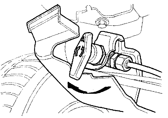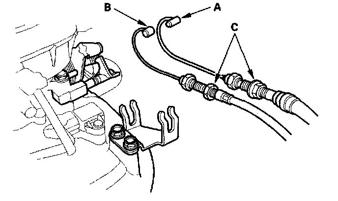 14. Remove the throttle cable (A) and cruise control actuator cable (B) by loosening the locknuts (C), then slip the cable ends out of the accelerator linkage. Take care not to bend the cables when removing them. Always replace any kinked cable with a new one.