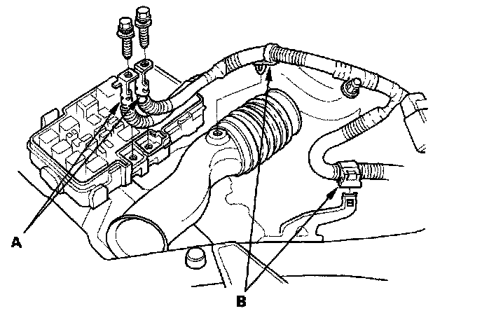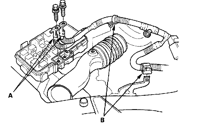 34. Install the battery cables (A) on the under-hood fuse/relay box, then install the harness clamps (B).
