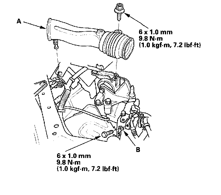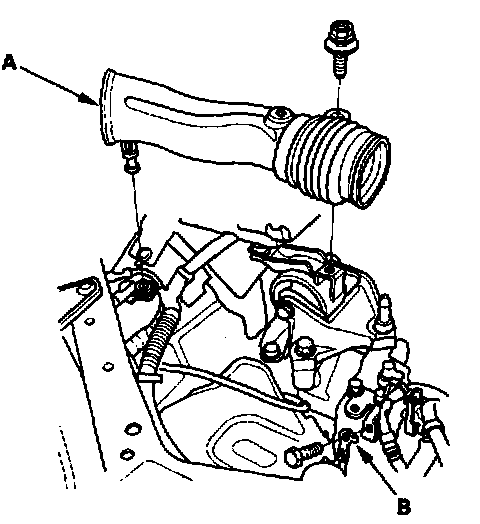 21. Install the A/C compressor (A), then install the alternator lower bracket (B).