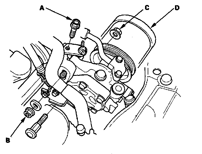 12. Remove the adjusting plate mounting bolt (A), locknut (B), and mounting nut (C), then remove the power steering (P/S) pump belt (D) and pump without disconnecting the P/S hoses.
