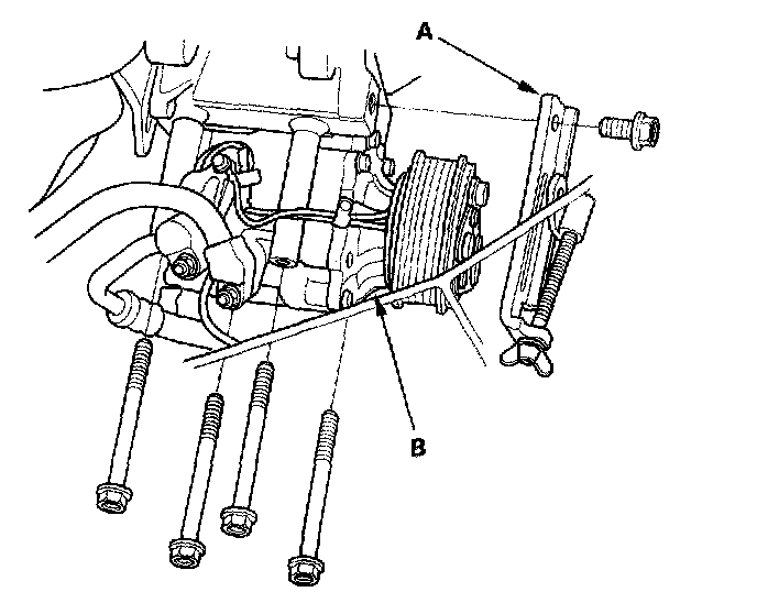 16. Remove the alternator lower bracket (A), then remove the A/C compressor (B) without disconnecting the A/C hoses.