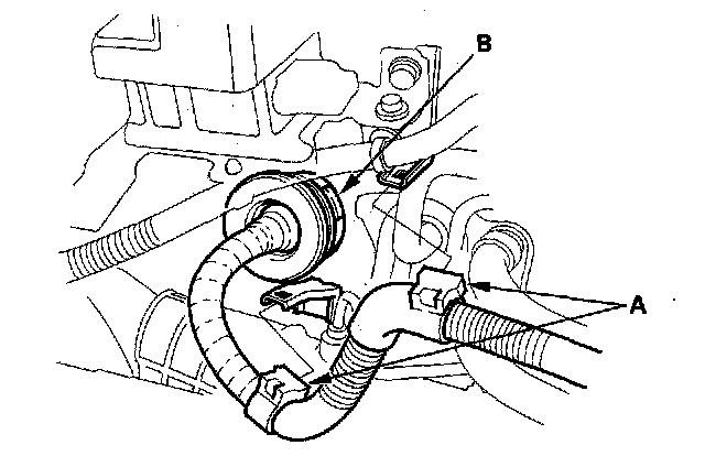 13. Remove the A/C hose bracket (A) and P/S hose bracket (B).