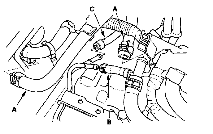 19. Install the heater hoses (A), pressure regulator water inlet hose B (B), and pressure regulator water outlet hose (C).