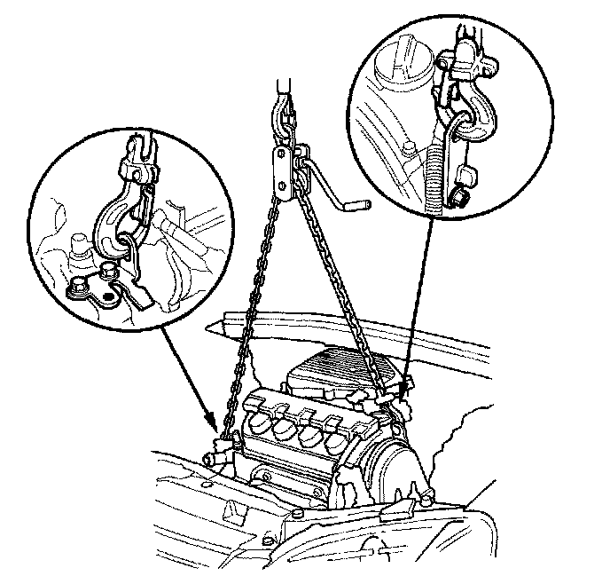 2. Position the engine/transmission assembly under the vehicle. Attach the chain hoist to the engine, then lift the engine into position in the vehicle.