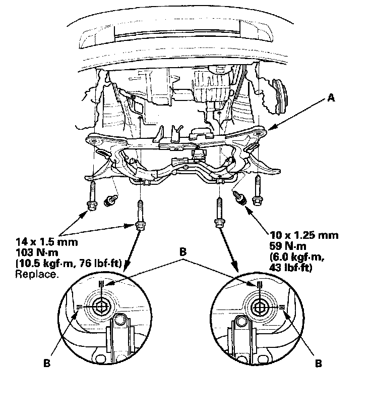 3. Install the subframe (A). Align the reference lines (B) on the subframe with the bolt head center, then tighten the bolts.
