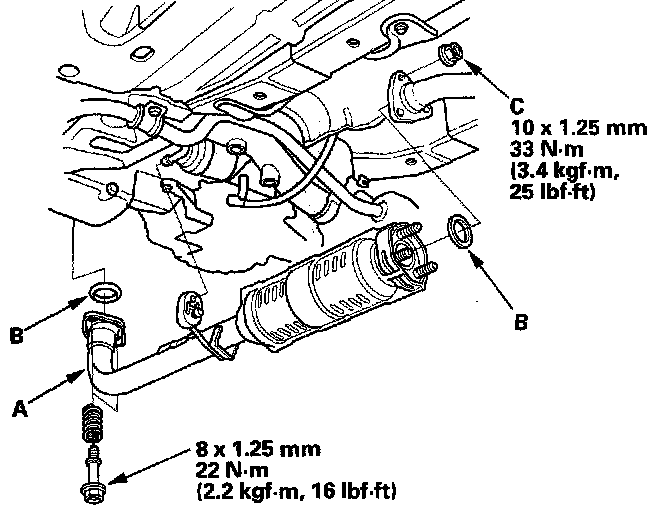 13. Install the exhaust pipe A/three way catalytic converter (TWC) (A), use new gaskets (B) and new self locking nuts (C).
