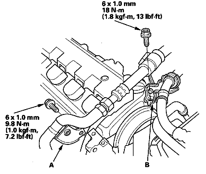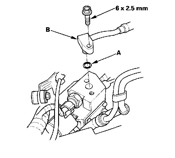 18. Install a new O-ring (A) on the fuel feed housing (B). Apply silicone oil to the O-ring and install the hose.