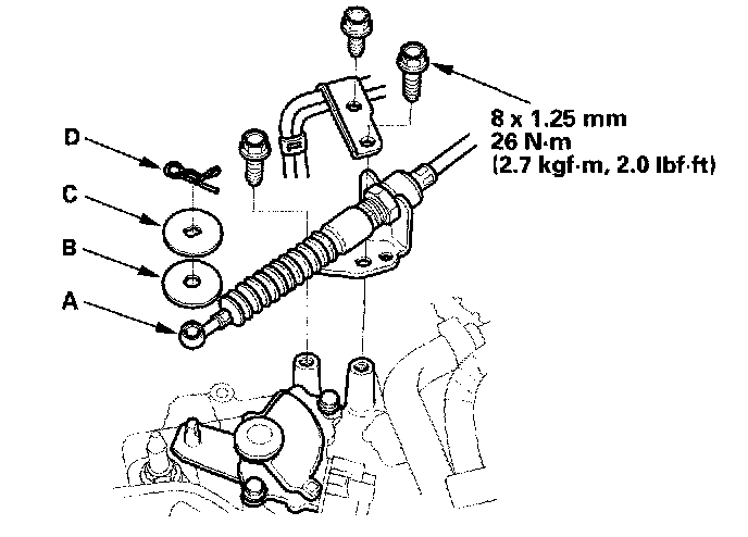 32. Install the shift cable (A) using the plastic washer (B), washer (C), and spring pin (D).