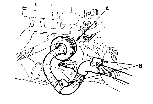 19. Remove the harness clamps (A) and grommet (B), then pull the engine wire harness through the bulkhead.