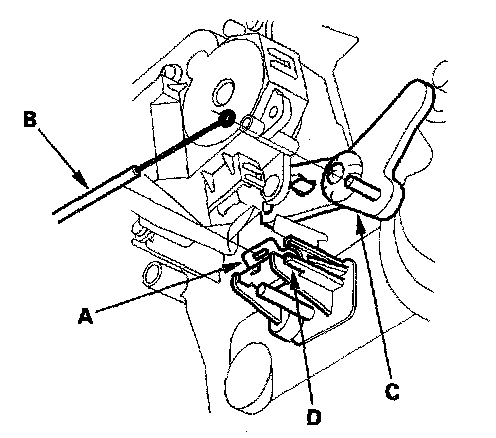 4. Attach the heater valve cable (B) to the air mix control linkage (C) as shown. Hold the end of the heater valve cable housing against the stop (D), then snap the heater valve cable housing into the cable clamp (A).