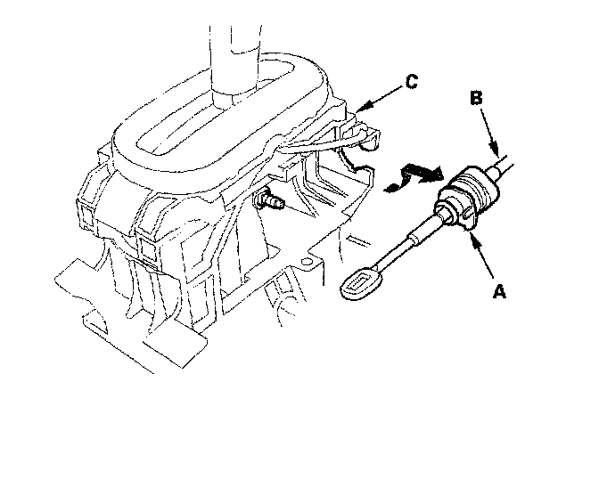 5. Rotate the socket holder (A) on the shift cable (B) toward the shift lever a quarter turn, then slide the holder out to remove the shift cable from the shift cable bracket base (C).