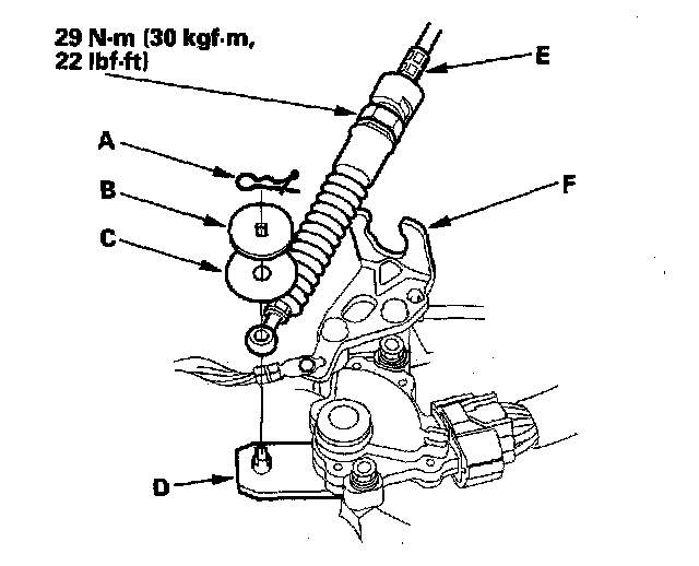 12. Align the socket on the shift cable with the slot in the shift cable bracket (F), then install the socket in the bracket and the shift cable end to the control lever. Do not bend the shift cable excessively.